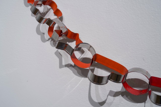 Andrea Mueller’s cookie cutters, hung from the wall like a garland, drew me back for another look. Titled Knead Nuance, each cookie cutter is painted a different colour on the inside, serving as a reminder of the difference and nuance amongst the repetition of domesticity and motherhood.