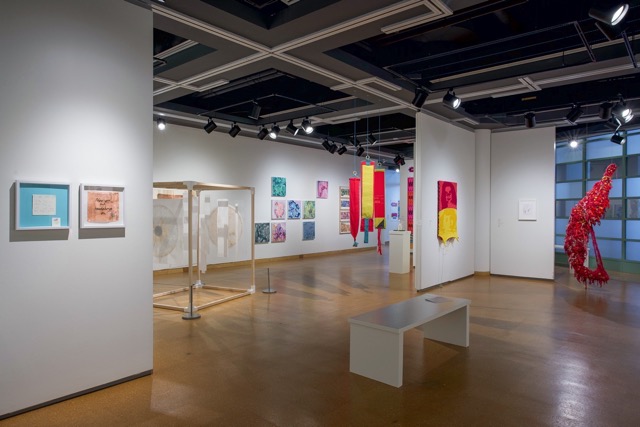 I visited the exhibition on the eve of the opening party. The gallery was heaving with people spilling out into the main atrium. Bells were ringing (Sarah Jane Estabrooks’ work), yarn was intentionally being unravelled from a wall-mounted machine-knitted work (Greta Grip). Kids of all ages were weaving through the crowd. A toddler may or may not have left a handprint on a low hanging drawing.